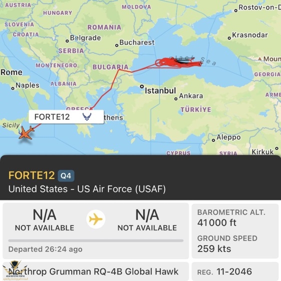 هذا المسار المعتاد اليومي لها منذ بداية الحرببالمناسبة .. الـ RQ-4B Global Hawk لها يوم كامل في الأجواء الدولية في البحر الأسود تمسح وترتب .. بعد العملية عادت تقريباً .
