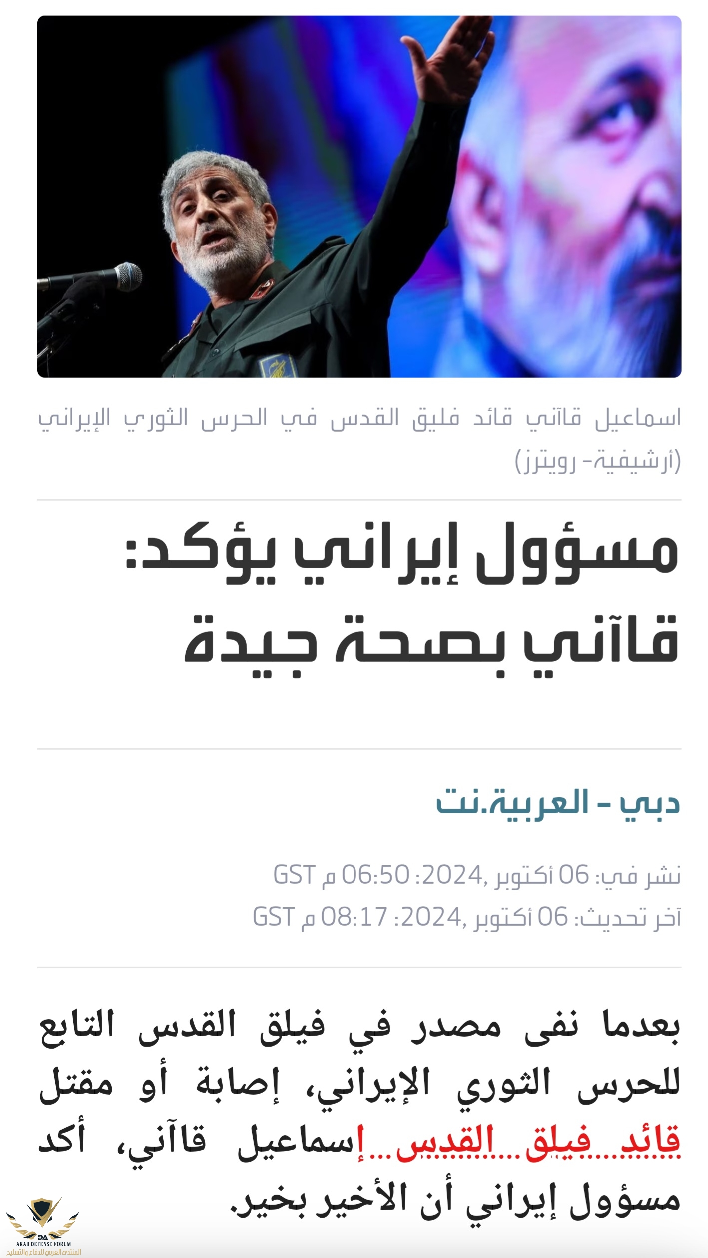 هم أعلنوا ان بخير وطيب ولكنهم لايعلمون عن مصيره..رح حللها....هل تتحلل..تاكيدات ايرانية و اسراىيلية ان اسماعيل قااني حي ،واضح الجرذ مختبى مخافة ان يتم اصطياده في الايام الماضية