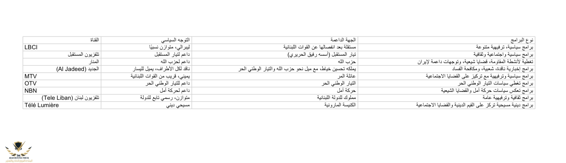 هل يملك احد قائمة بالقنوات اللبنانية وتوجه كل قناة والجهة التي تتبع لها؟ القنوات اللبنانية كثيرة ولم اجد عن طريق جوجل اي قائمة مشابهة.