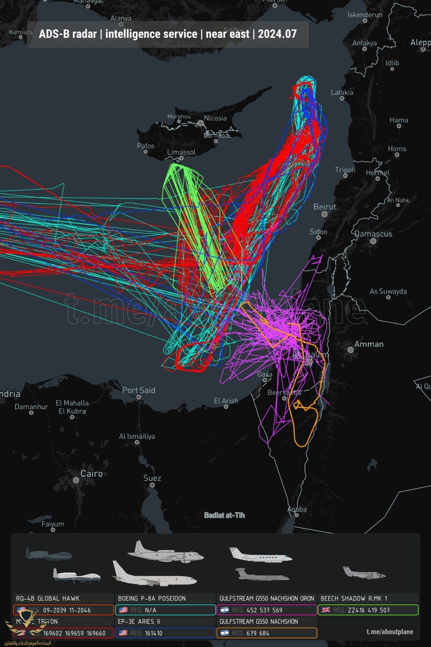 نشاط طائرات التجسس في شرق البحر الأبيض المتوسط في يوليو 2024يوليو 2024 | تركيز أنشطة المراقبة الأمريكية والبريطانية والإسرائيلية على غزة ولبنان وسوريا.