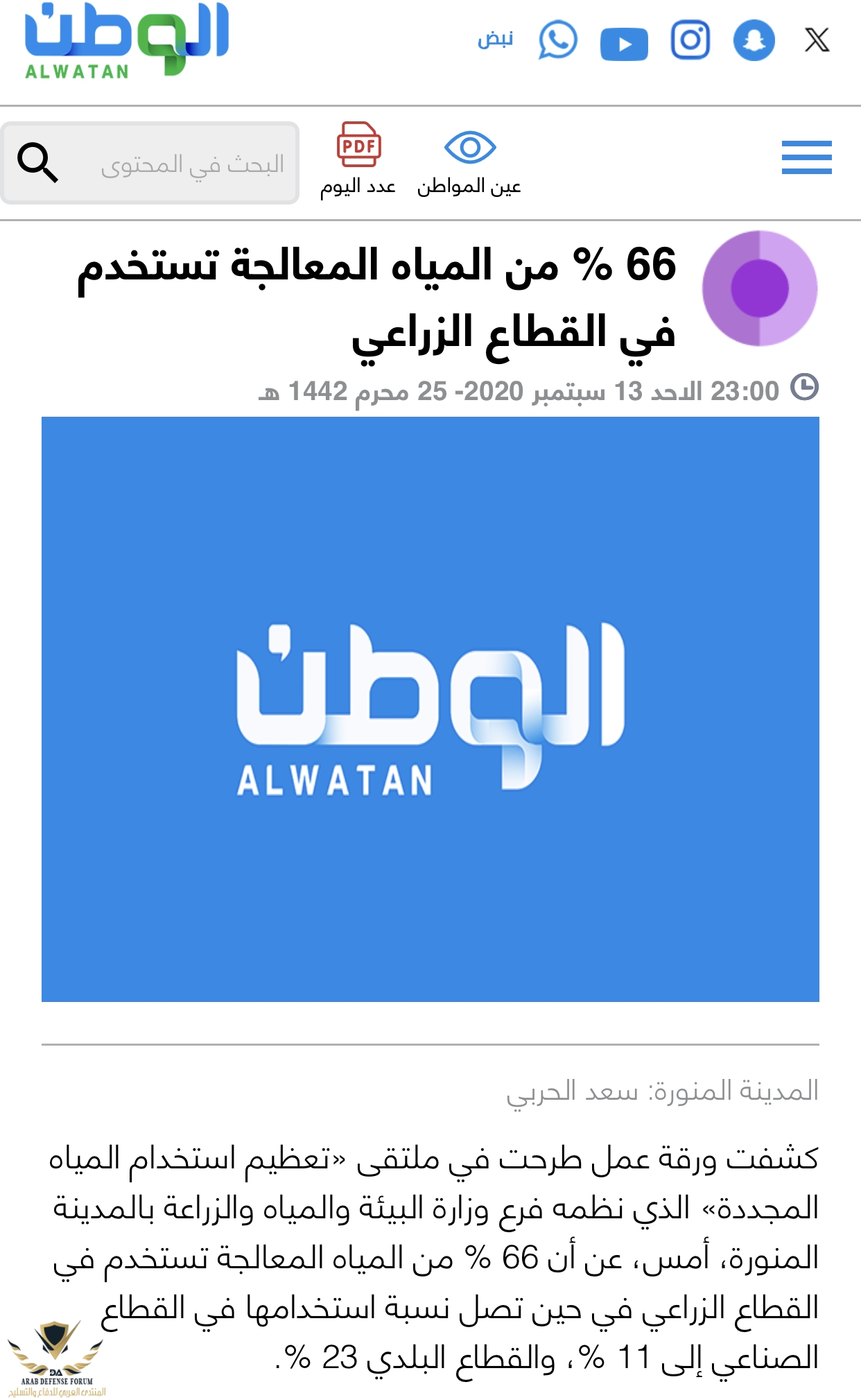 ونقاشت 4 جهات هي الشركة السعودية لشراكات المياه، والمؤسسة العامة للري وشركة المياه الوطنية ووكالة المياه بوزارة البيئة والمياه والزراعة، كيفية الاستفادة من المياه المعالجة وزيادة الضخ، وذلك باستطلاع آراء المهتمين ومدى الحاجة والرغبة للمشاركة في تطوير مشروع تعظيم الاستفادة من استخدام المياه المجددة الناتجة من موقع محطة المدينة المنورة لمعالجة الصرف الصحي، بمشاركة القطاع الخاص، بما يعزز الإنتاج الزراعي والاستدامة البيئية.
