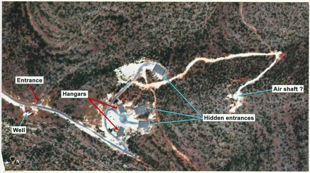 تُظهر أحدث صور الأقمار الصناعية ستة مبانٍ: دار حراسة وخمسة حظائر، ثلاثة منها تخفي مداخل المنشأة الموجودة بالأسفل