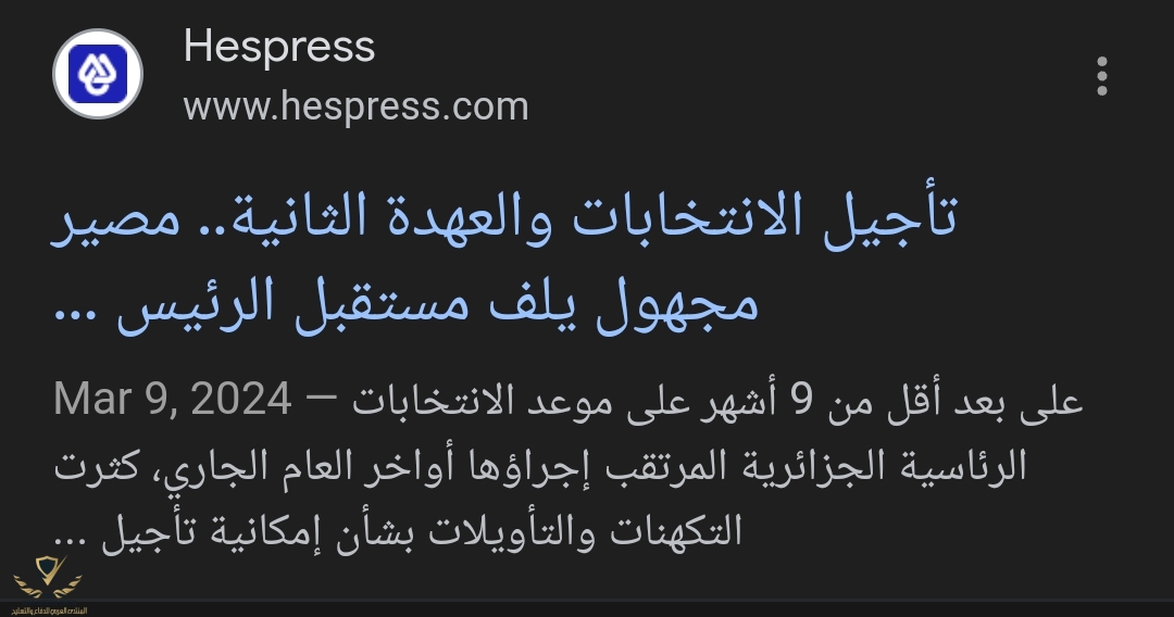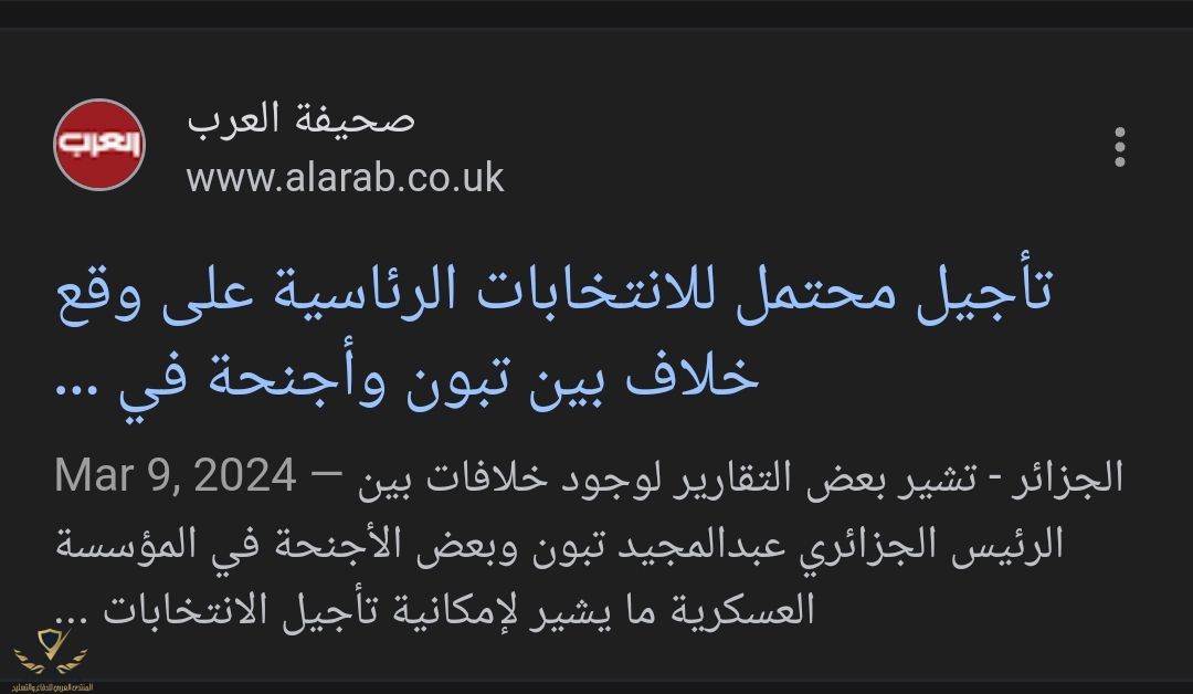 حتى الصورة التي شاركت تبين أن الصحف العربية نقلت الخبر لكن أنت مهتم أكثر بالنغرب... على أيالخبر هو فقط نقل عن تقرير صحفي فرنسي و الذي اتهم القيادة الحزائرية بمحاولة التملص من الانتخابات و رد الإذاعة الرسمية الجزائرية الذي استحي أن أشاركه في المنتدى ... السؤال يبقى لماذا رد نظام على الصحافة الفرنسية و أعلن الانتخابات المبكرة ؟؟