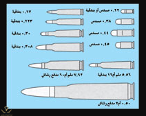 أنواع عيارات الطلقات الشائعة. معظم الطلقات، كما في الرسم، تقاس بموجب عياراتها (أقطار رصاصاتها) وتذكر قياساتها بحساب الكسور العشرية للبوصة أو السنتيمتر أو المليمتر.