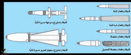 أنواع ذخيرة المدفعية تنطلق بعض أنواع قذائف المدفعية إلى هدفها، انظر إلى الجزء الأيمن من الرسم التوضيحي، بوساطة نوع من المتفجرات يسمى الوقود الدافع. وتتحدد كشمية المادة المتفجرة داخل القذيفة بنوع القذيفة وعلى المدى الذي يجب على القذيفة أن تقطعه للوصول إلى الهدف. وتنطلق الذخائر الذاتية الدفع التي تستعمل للمدفعية تحت تأثير قوة الدفع المولدة ذاتيًا، انظر إلى الجزء الأيسر من الرسم.