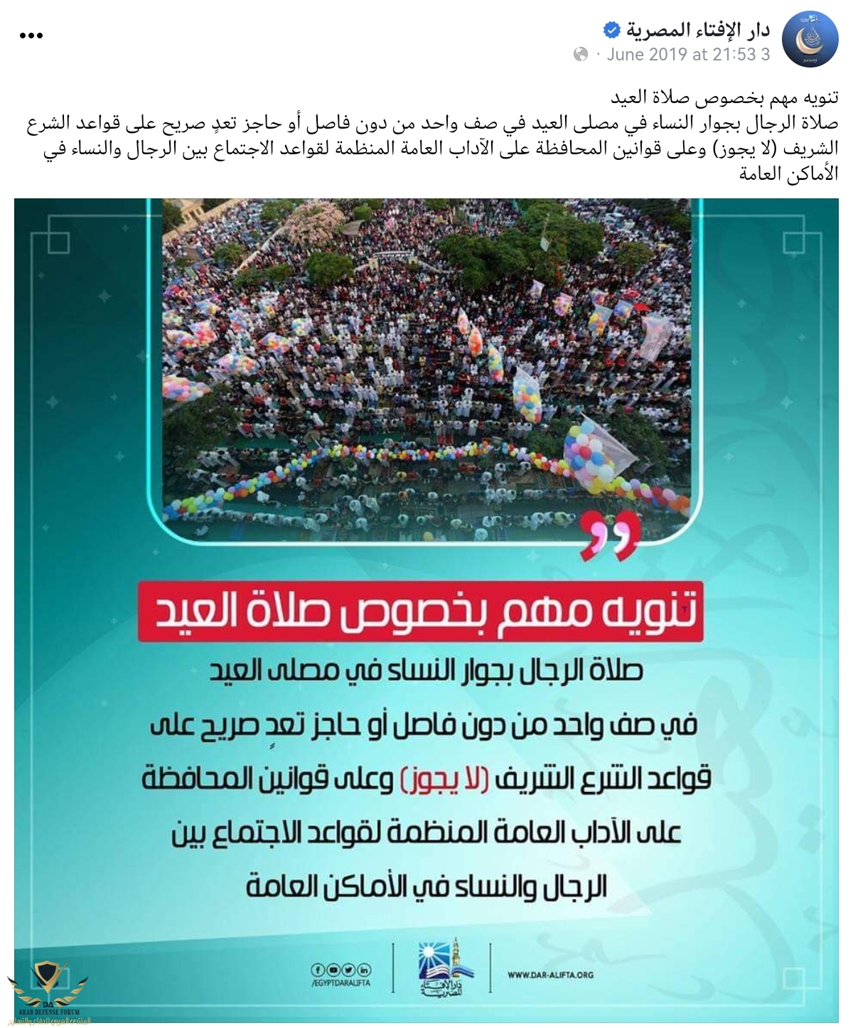 أن صلاة الرجال بجوار النساء في مصلى العيد في صف واحد من دون فاصل أو حاجز