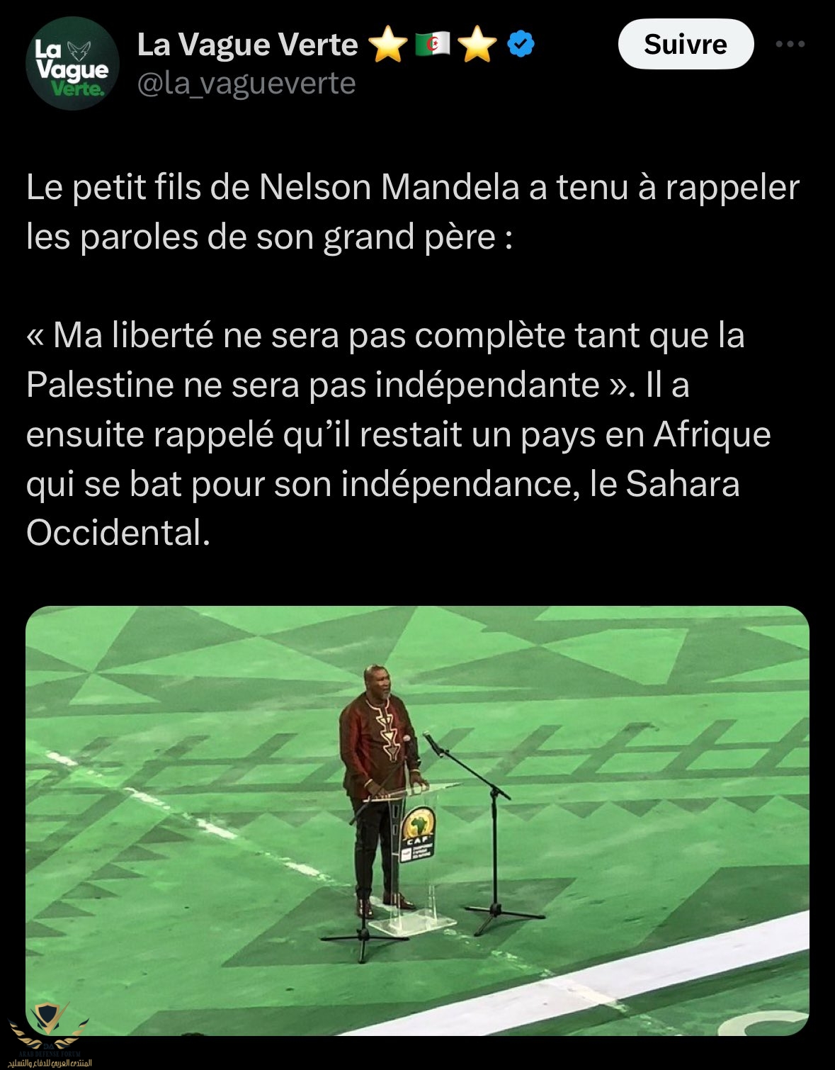 و في نفس الوقت و قبل سنة اثناء افتتاح الجزائر لملعبها نيلسون مانديلا تم اقحام السياسة دون اعتبار للقوانين الرياضية الرسمية