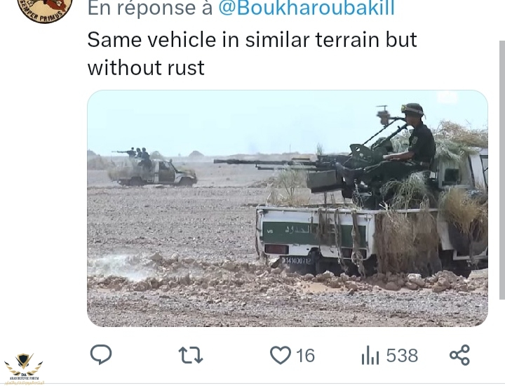 الطبيعة مختلفة تماما... وين شايفها نفس الطبيعة...تمرين البارحة في منطقة صحراوية...اين ينعدم فيها غطاء نباتي انما تواجد للرمال فقط لذلك شفنا تمويه المركبة بذلك الشكل ...الصورة من تمرين سابق..في منطقة شبه صحراوية صخرية وتعرف تواجد بعض النباتات المقاومة للجفاف..لذلك تم تمويه المركبة ببعض النباتات...شرف لنا أنه ليس لدينا متابعين مثل أمثالك و العياذ بالله ...