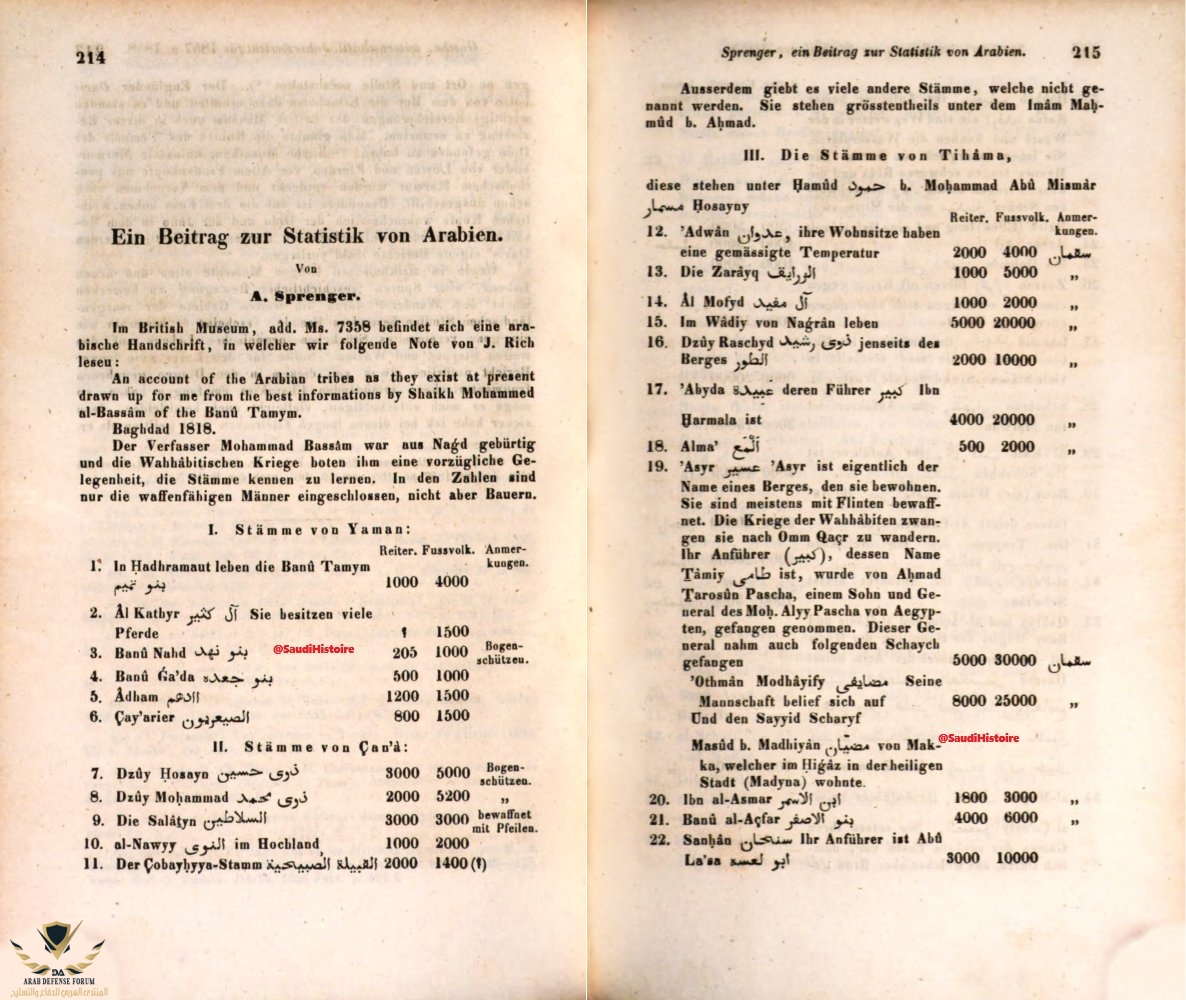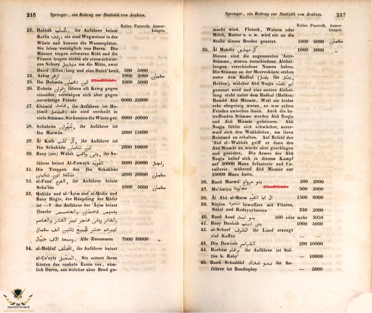 حصلت على وثائق من الجمعية الجغرافية الالمانية والبريطانية تبين تعداد مشاة وفرسان القبائل التي اتحدت وكونت الدولة السعودية الاولى..