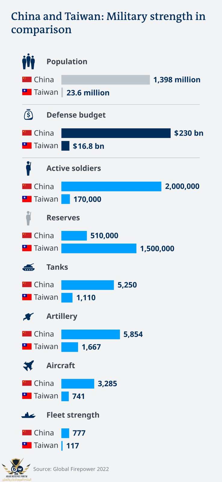 1) تمتلك تايوان ما يقرب من نصف القوى العاملة في أوكرانيا، وتمتلك الصين 10 أضعاف القوى العاملة في روسيا.الموضوع مش خزان المسرح العملياتي هناك يختلف المساحه العدو البنيه التحتيه