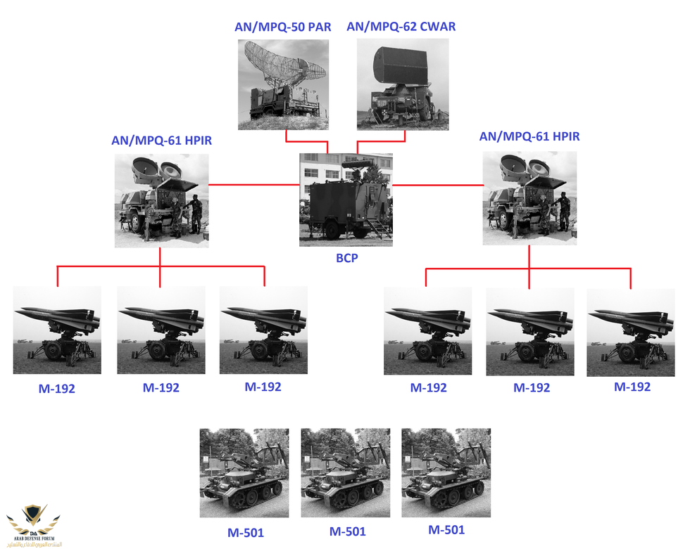 FalconFFY قال: بيض الله وجهك صورة تختصر الكثير أنقر للتوسيع... واياك يالطيب وهذه صوره اخرى معبره عن بطارية صواريخ هوك ونشره معها، علما انه رادار نبضي Pulse Radar يعمل الى جنب مع رادار موجه مستمره CW لكشف الاهداف وتتبعها وتمرير الاشاره لقيادة البطاريه لغرض اضاءه برادار الاشتباك حال تاكيده ومن ثما اطلاق الصاروخ.