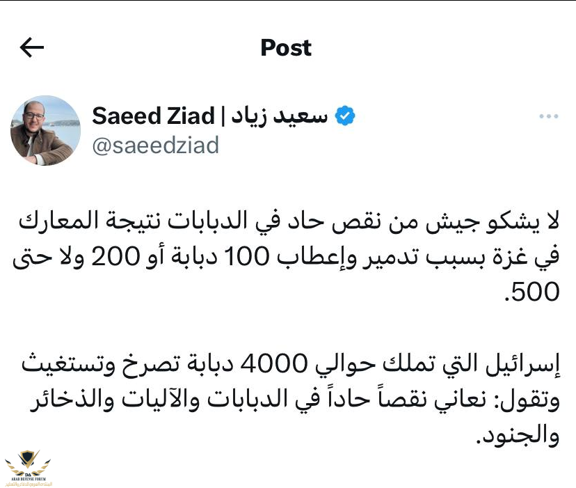 لا ننسي الدعم الامريكي المهول في حرب 73 ومئات الدبابات الحديثة وقتها من طراز M 60 والتي عند أسر بعضها وجد ان عدادتها لم تتجاوز مئات الكيلومترات من السير اي انها كانت جديدة تماماً من المصنع لميدان القتال .. فهل سيعيد الصهاينة حساباتهم عقب الحرب ونجد في المستقبل دبابات الإبرامز او الليوبارد داخل وحداتهم البرية تحسباً لأي مواجهة كبري لضمان استمرار إمدادهم بالسلاح !!
