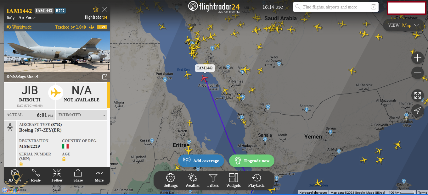 رصد خط سير لطائرة عسكرية ايطالية (تزويد بالوقود) من نوع BOEING 767-2EY والتي انطلقت قبل ساعتين من القاعدة الأمريكية في جيبوتي.