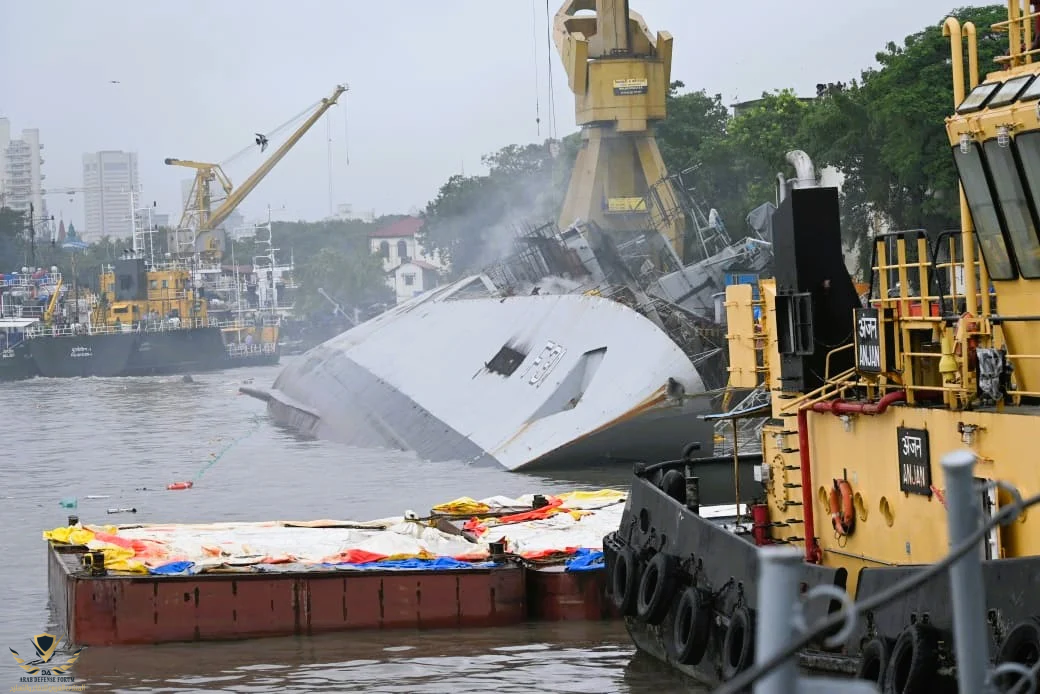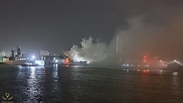 اندلع حريق على متن الفرقاطة متعددة المهام "براهمابوترا" التابعة للبحرية الهندية أثناء خضوعها للصيانة في حوض بناء السفن البحري في مومباي.