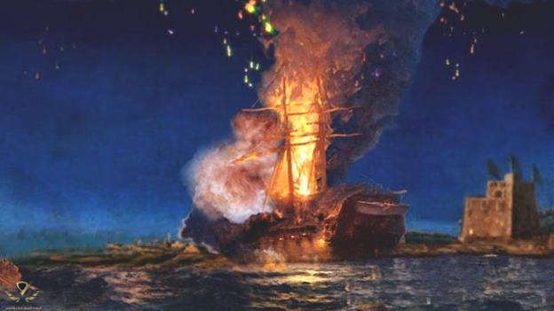 حريق يو إس إس "فيلادلفيا" في معركة ميناء طرابلس خلال حرب البربر الأولى عام 1804