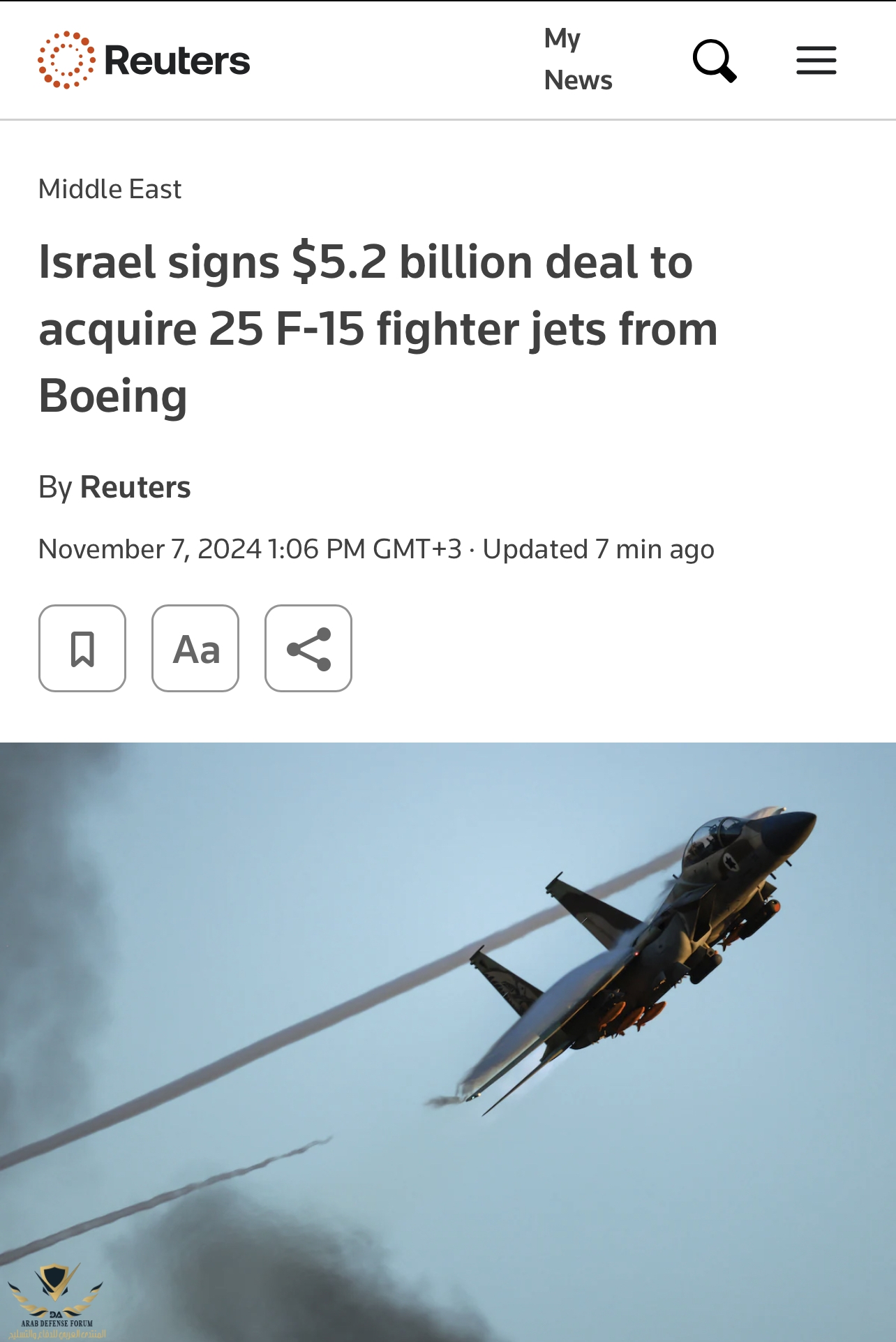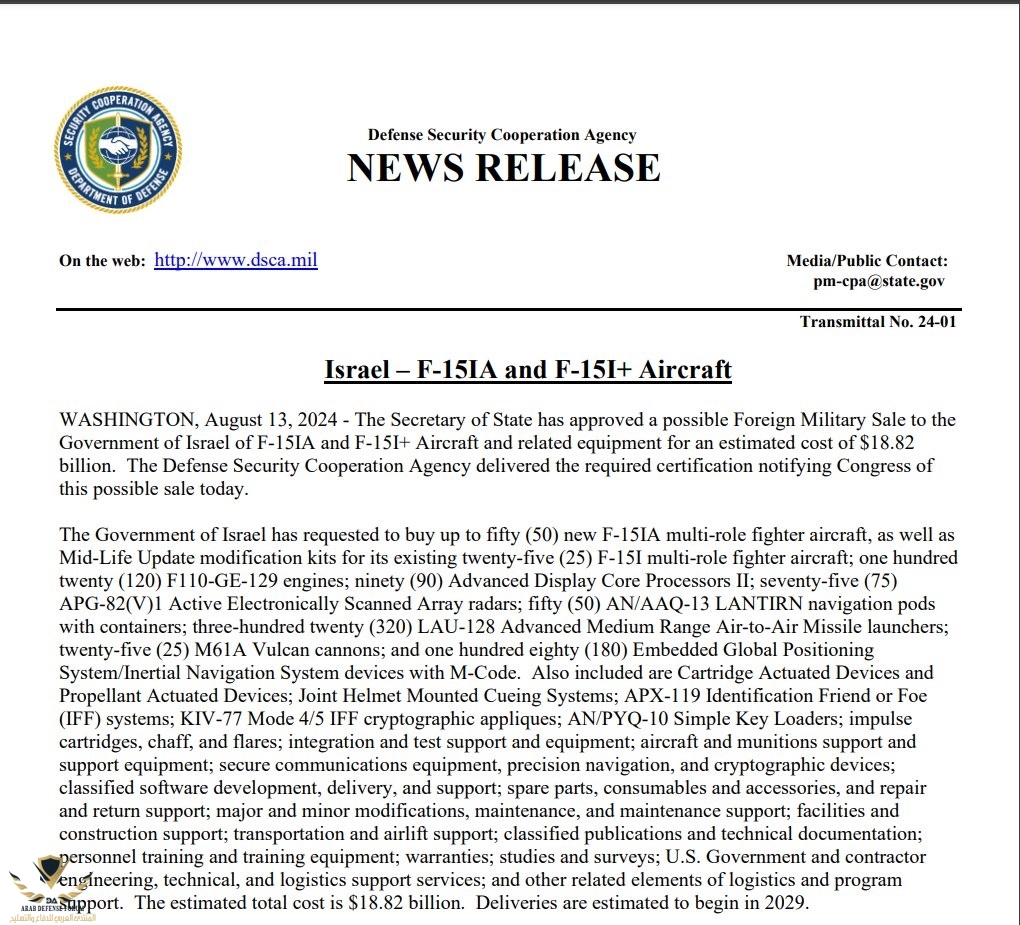 وافق وزير الخارجية الأمريكي على بيع طائرات مقاتلة من طراز F-15IA لإسرائيل بقيمة 18.82 مليار دولار - وهي النسخة الإسرائيلية من طائرة F-15EX المتقدمة - ومجموعات لطائرات F-15 الموجودة لدى سلاح الجو الإسرائيلي.وبحسب البيان الصحفي، من المتوقع أن تبدأ عمليات التسليم في عام 2029.وفي العام الماضي، قدمت إسرائيل طلبا رسميا إلى الولايات المتحدة بشأن شراء 25 طائرة مقاتلة من طراز F-15IA، مع خيارات لشراء 25 طائرة أخرى