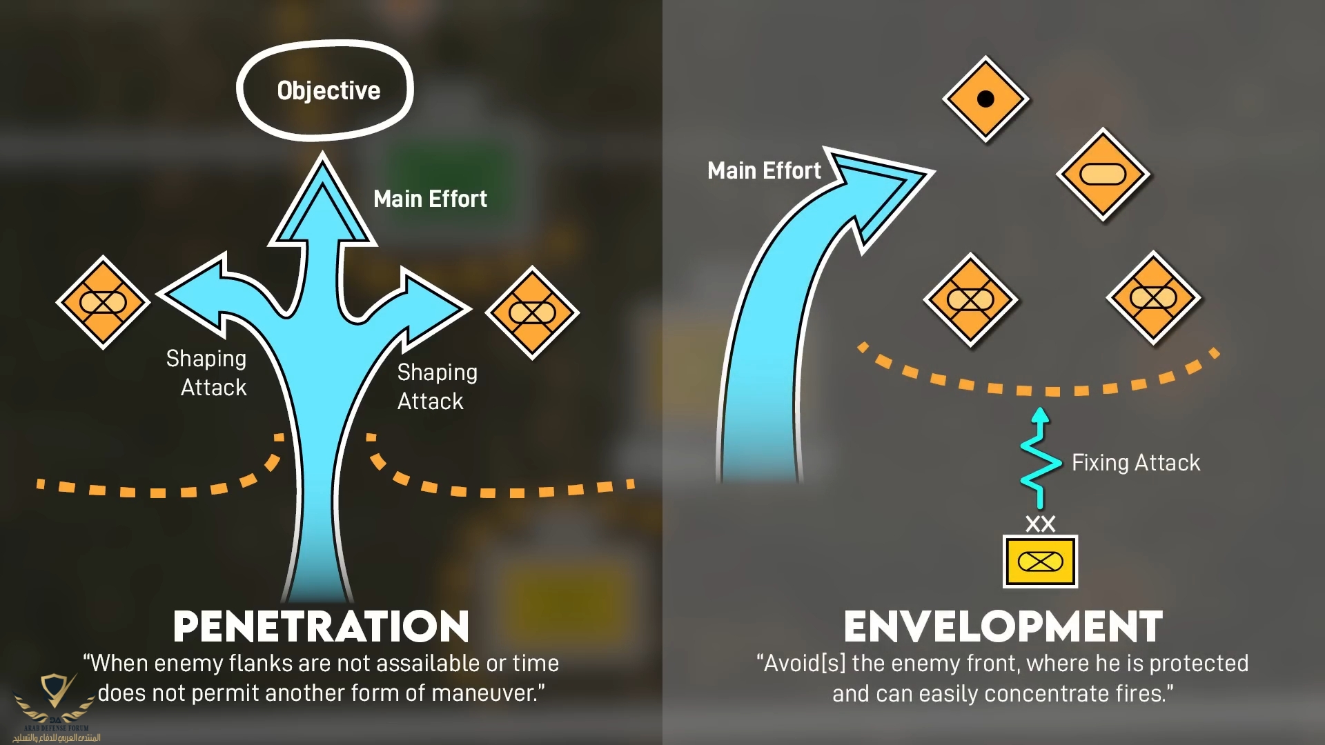 للتنويه فقط المناورة بالقوات لا تكون فقط في حالة الهجوم بل في الدفاع أيضا في حالة الهجوم المفاجئ العدو