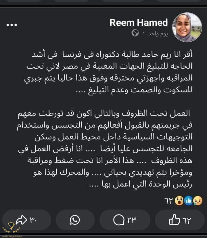 أنباء عن إغتيال الباحثه المصريه ريم حامد فى باريس من جهه مجهوله. كانت بتحضر الدكتوراه فى معهد البيولوجيا التكاملية للخليه وهى حاصله على درجة بكالوريوس فى التكنولوجيا الحيويه من جامعة القاهره ودرجة الماچيستير فى علم التخلق من جامعة باريس.