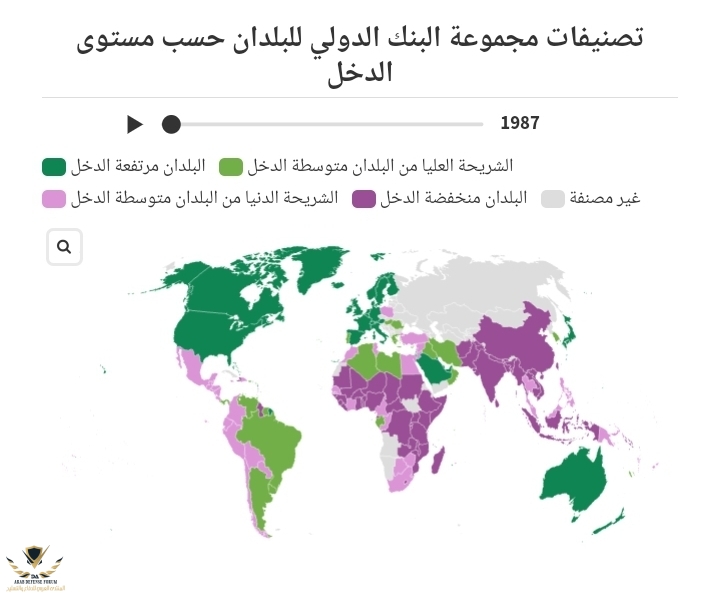 تصنف مجموعة البنك الدولي اقتصادات العالم إلى أربع مجموعات للدخل وهي: البلدان منخفضة الدخل، والشريحة الدنيا من البلدان متوسطة الدخل، والشريحة العليا من البلدان متوسطة الدخل، والبلدان مرتفعة الدخل. ويتم تحديث هذه التصنيفات في الأول من يوليو/تموز من كل عام، استناداً إلى نصيب الفرد من إجمالي الدخل القومي في السنة الميلادية السابقة. ويتم التعبير عن مقاييس إجمالي الدخل القومي مقومة بالدولار الأمريكي باستخدام عوامل تحويل مشتقة حسب طريقة أطلس التي بدأ العمل بها في شكلها الحالي في عام 1989 . وتهدف تصنيفات البنك الدولي لمستويات الدخل إلى تجسيد مستوى التنمية في بلد ما، اعتماداً على طريقة أطلس لحساب نصيب الفرد من إجمالي الدخل القومي باعتبارها مؤشراً متاحاً على نطاق واسع للقدرة الاقتصادية.