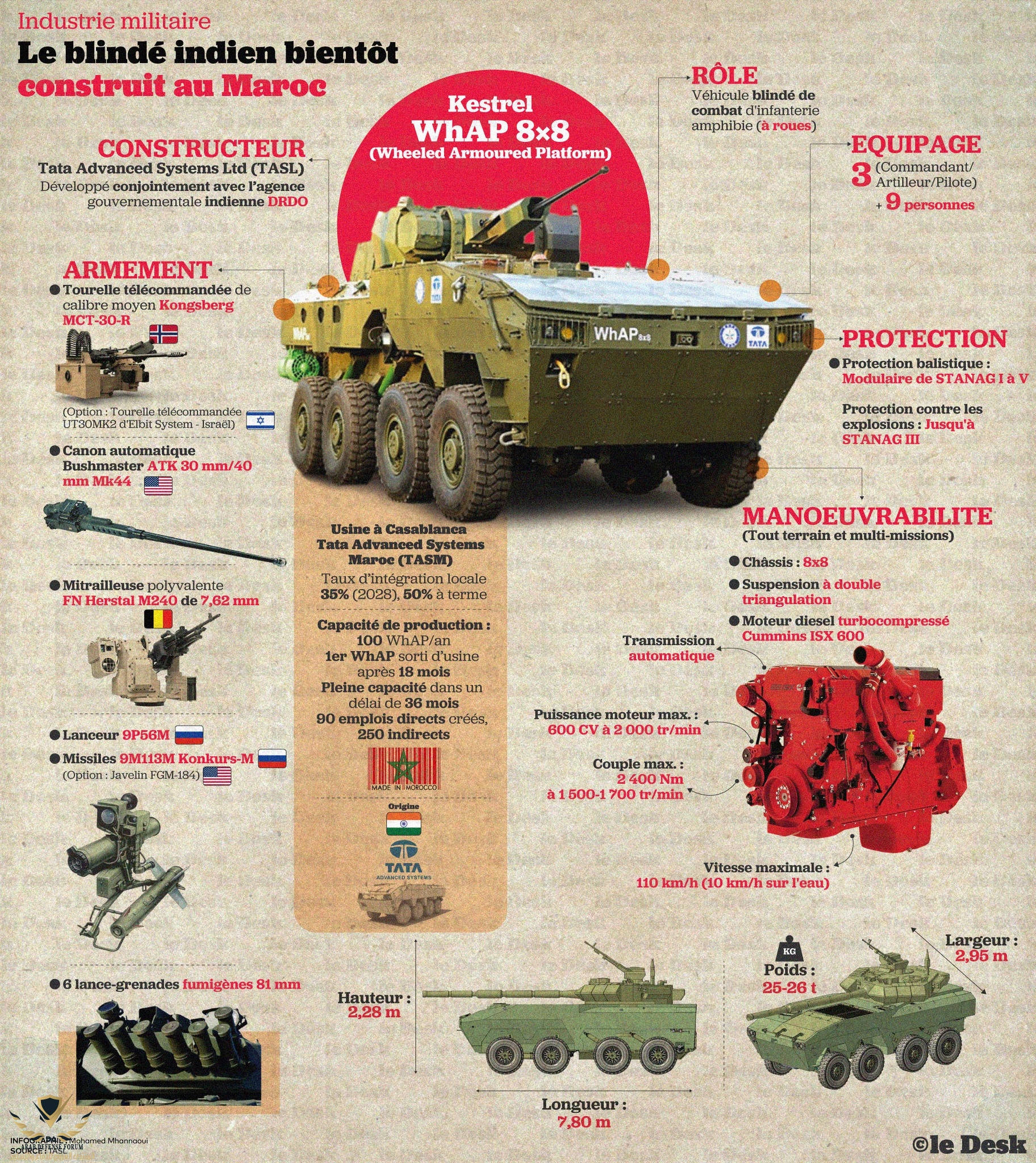 هدفها: إنتاج كميات كبيرة للجيش المغربي، ولكن أيضًا لتصدير أحد منتجاتها الرئيسية: مركبة المشاة القتالية المدرعة البرمائية WhAP 8x8، المعروفة أيضًا باسم Kestrel. وفيما يلي خصائص ومخططات المشروع