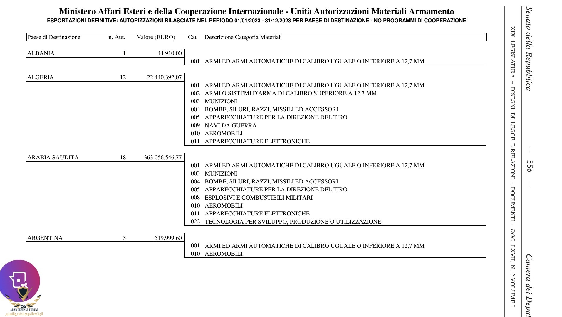 أصدرت وزارة الخارجية الإيطالية تقريرها السنوي لصادرات الأسلحة , وتضمنت اللائحة قائمة الدول التي تسلمت اسلحة ومعدات عسكرية ايطالية خلال سنة 2023 وجائت كل من الجزائر والعربية السعودية من ضمن الدول العربية التي تحصلت على معدات دفاعية من روما ...