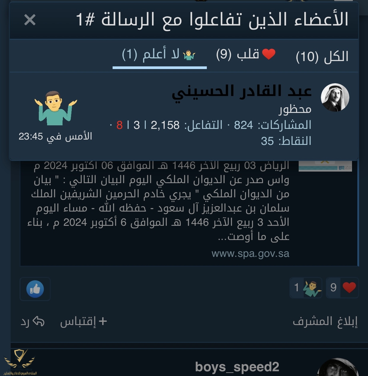 ربنا يشفية يا رب ولو ليا حق الاقتراح يعني اتمني الملك يتخلي عن العرش للامير محمد وهو علي قيد الحياة اولا كسنة بان الحاكم غير القادر بحكم السن علي الحكم يتخلي عن منصبه طوعا ثانيا تولي الامير محمد الان في حياة والده قد يجنب المملكة اي سيناريوهات لا قدر الله بعد وفاة الملك والله اعلمصدر عن الديوان الملكي اليوم البيان التالي :