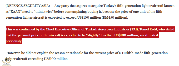 المشكلة في KAAN هي سعرها حسب التقارير سعرها 100 مليون دولار يعني سعر ينافس الطراز B , C من اف35 و اضعاف سو 75 و سو 57 فاعتقد الاهتمام مش في شراء الطائرة لنفسها فقط بل ايضا لنقل التكنولوجيا لانه سعرها مرتفع