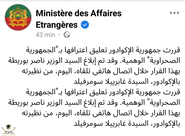 أبلغت وزيرة الشؤون الخارجية بالإكوادور، السيدة غابرييلا سومرفيلد، خلال اتصال هاتفي، نظيرها المغربي، السيد ناصر بوريطة، بهذا القرار وبرسالة الإخطار التي وجهتها إلى ممثلية الانفصاليين في كيتو.