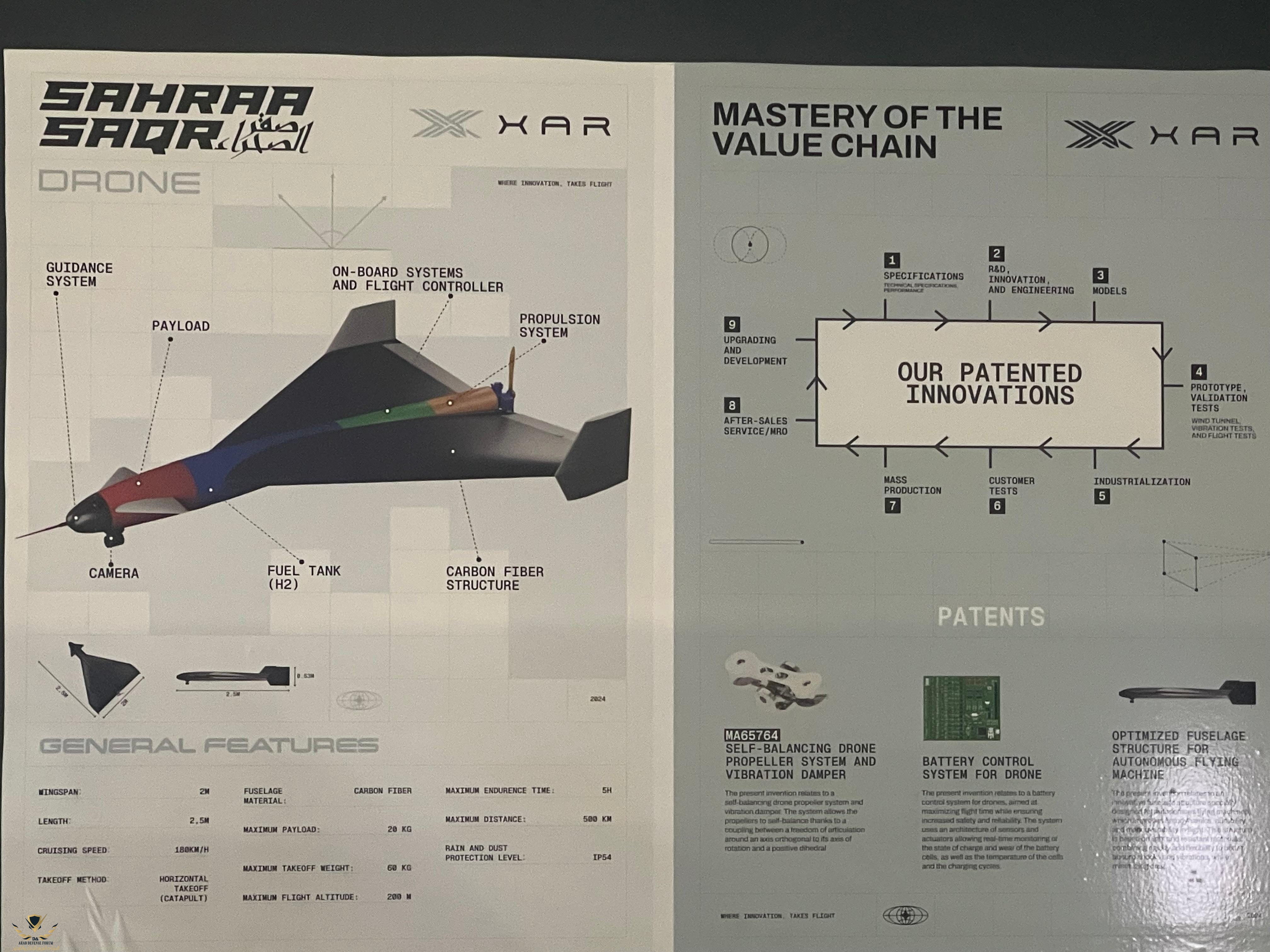 ثانيا لا زلت لم تجب على سؤالي الذي طرحته على العضو 😊أنا أتحدث عن درون p1 صاحب مدى 50km وهو درون محلي باستثناء المحرك، هذا تصريح صاحب الشركة ، أما عن التفاصيل فليس لدي ما قد يفيدك، كيف تريد مني اعطاؤك التفاصيل او الاثباتات ونحن كل ما نملك هو مقطعين او ثلاثة من معرض مراكش للطيران، الحدث جديد ولم يتم اعطاء التفاصيل غير ما ذكرته لك من ان القطع والبرمجة وAI ونظام التوجيه صناعة مغربية من شركة ballistic defense system بالرباط، اما عن درون صقر الصحراء الاسود ذو الاطار الكربوني فليس لدي اي معلومة عنه الا ما صرح صاحب شركة xar بانه بمدى 500km وبسرعة 186km/h وان رأسه المتفجر 20kg هذا ما صرح به صاحب الشركة