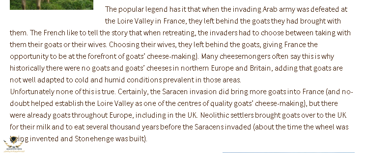 هنا في فرنسا لم يكونوا يعرفوا لحم الماعز ولا حليبها ولكن بالفتح الاسلامي وصلوا الى سهول بواتييه وهي قرب مدينة تسمى تور بمعنى ثلث فرنسا تماماً ودارت معركة تسمى بلاط الشهداء بين عبد الرحمن الغافقي وواحد يسمى تشارلز المطرقة وهو احد اجداد شارلمان العظيم بعدها انسحب الجيش المسلم وعاد جنوباً ولكن ترك كامل قطعان الماعز والخراف فأخذها الفرانكس وتعلموا منها انواع حليب الماعز والغنم ولحومها ولم يكونوا قبل ذلك يعرفوا البان الماعز ولا لحومها