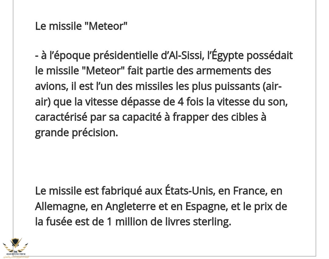 - في عهد السيسي الرئاسي كان لدى مصر صاروخ "الميتيور" وهو جزء من تسليح الطائرات، وهو من أقوى الصواريخ (جو – جو) التي تتجاوز سرعتها 4 أضعاف سرعة الصوت، وتتميز بقدرتها على إصابة الأهداف بدقة كبيرة.