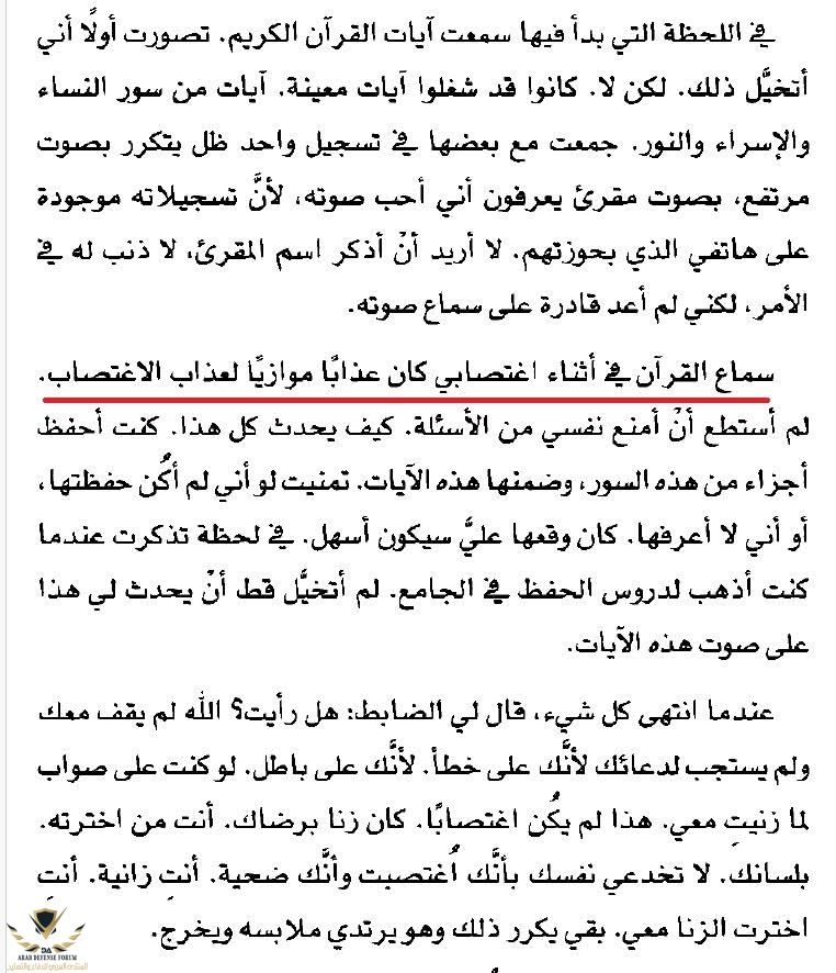 وفى اثناء الاغتصاب بيشغلوا ايات قرآنية.. فى العادة بتحكى المغتصبة انها بيجيلها عقدة نفسية من شيء او حدث ما متعلق بعملية الاغتصاب.. يعنى مثلا لو واحدة تعرضت للاغتصاب فى اوتوبيس هتلاقيها تكره الاوتوبيسات طول عمرها لانها بتفكرها باليوم اياه.. او لو واحدة تعرضت للاغتصاب من رجل اسود هتلاقيها تكره السود لانهم بيفكروها باللى حصل.. المفجع هنا فى عملية غسيل الدماغ دى هو ربط الاغتصاب بالقرآن.. تقوم المغتصبة من دول تكره القرآن تلقائيا لأنه هيفكرها باللى حصل.. يعنى مش بس لوثوا الضحية بقذارتهم وزرعوا فى احشائها طفل ابن حرام "بيقتلوه قصاد عينيها بعد كده".. كمان دول بيجبروها على الكفر بالله عزوجل..