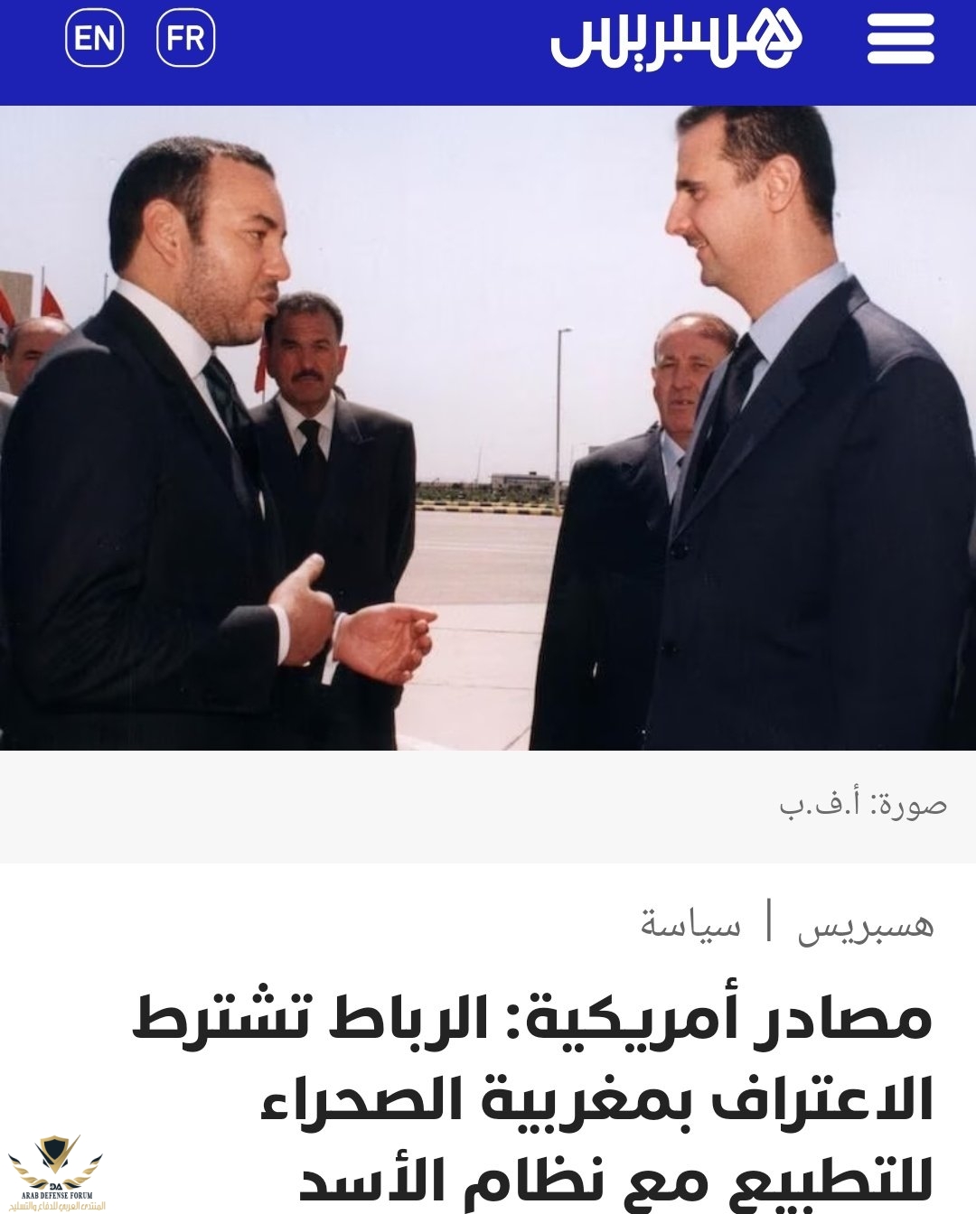 كمغربي لا تدخل نفسك في مشاركاتي لانك تعرف أين ستنتهي ....او اعترف بشار بمغربية الصحراء لطبعتهم معه ....لا فرق أصلا بين بشار و النظام الصهيوني و انتم طبعتهم مع الصهاينة....الكيان النجس محتل اراضي سورية حاليا يعني انتم تدعمون محتل سوريا ....خليك بعيد كما قلت عن مشاركاتي لاني لا أحب نفاقكمنعم كشعب نعم ( في غالبيته ) أما كنظامً عسكري فهو حبيب النظام الدموي الاسدي