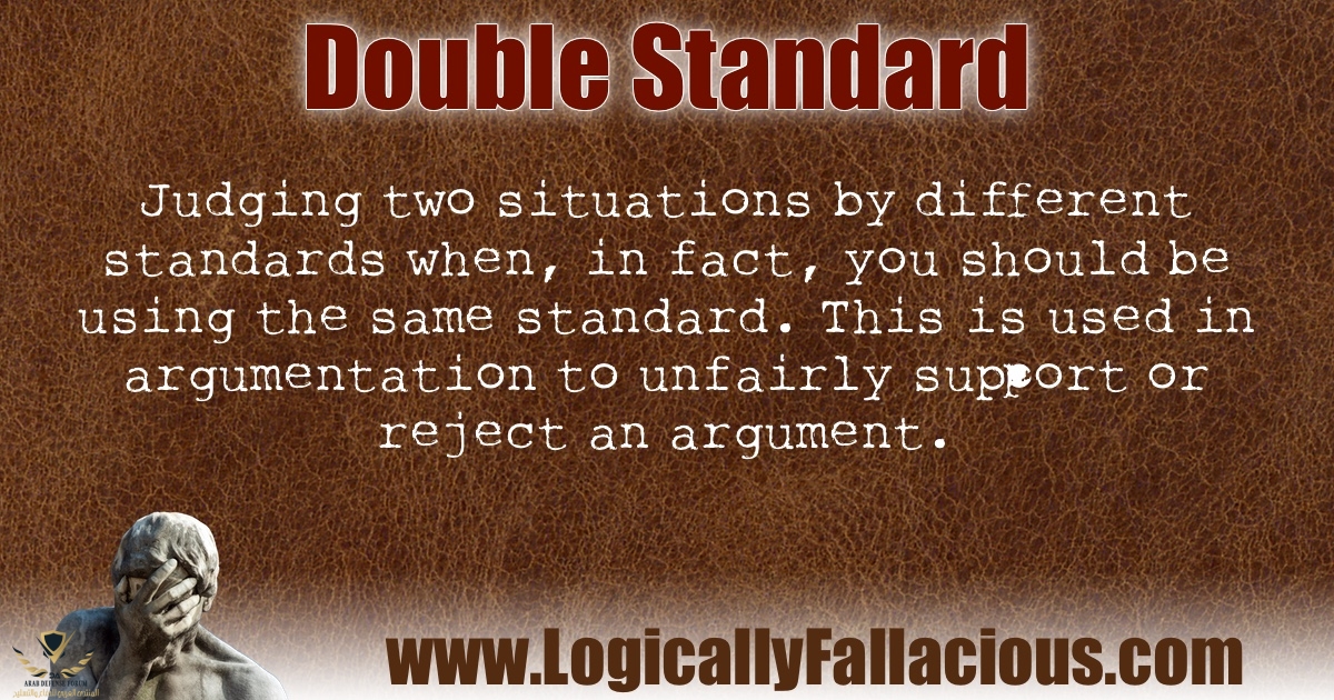 الحكم على موقفين بمعايير مختلفة بينما في الواقع، يجب عليك استخدام نفس المعيار. يُستخدم هذا في الجدال لدعم أو رفض الحجة بشكل غير عادل.