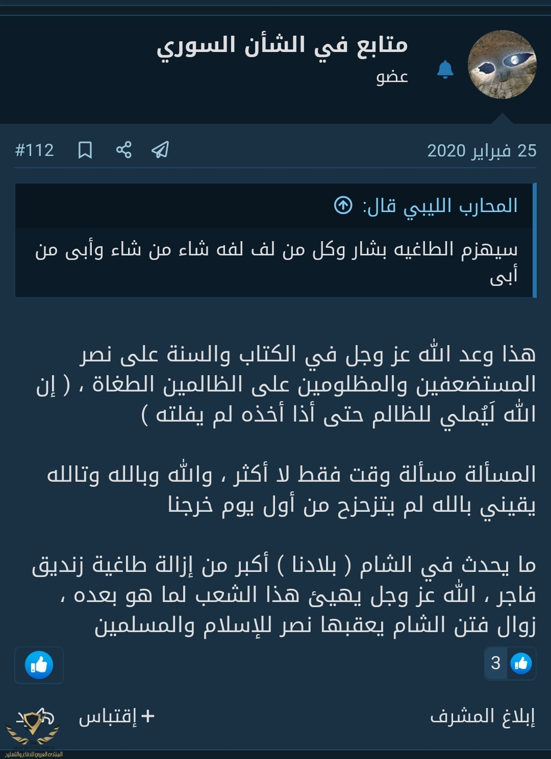مافي ولا مشاركة الي من هون لهونسبحان الله دائما إحتفظت في ذهني مشاركة الأخ @متابع في الشأن السوري و دعوة المظلومين مستجابة.