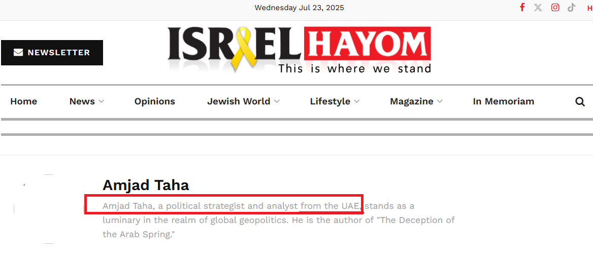 لكن حالياً أمجد طه ينشر مقالات في الصحف الإسرائيلية، وهذه الصحف تصف أمجد طه بأنه إماراتي