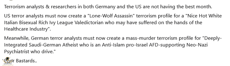 كل هذا يتراكم. فهل كان مرتكب هجوم ماغديبورغ عضوًا سريًا في تنظيم الدولة الإسلامية، متنكرًا في هيئة "مسلم سابق"؟ لقد هدد حياة ملحدين آخرين على موقع X، وكان في مهمة انتقامية من المملكة العربية السعودية، التي سعت إلى تسليمه.