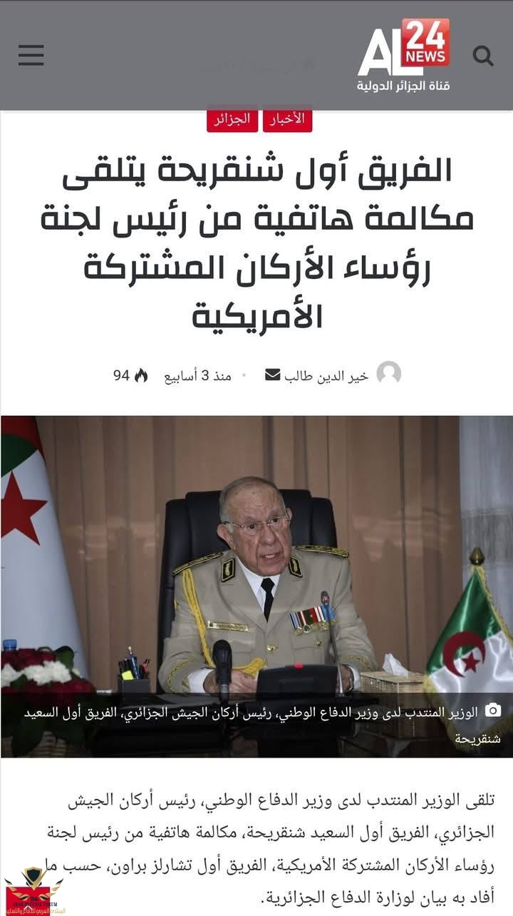 تلقى الفريق أول السعيد شنڨريحة الوزير المنتدب لدى وزير الدفاع الوطني رئيس أركان الجيش الوطني الشعبي، اليوم الإثنين، مكالمة هاتفية من رئيس لجنة رؤساء الأركان المشتركة الأمريكية الفريق أول تشارلز براون.