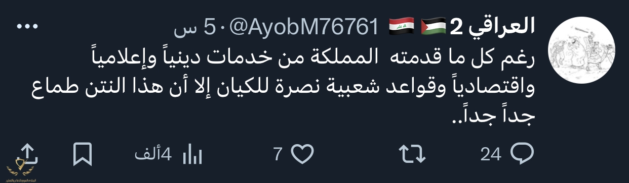 - المزايدين وما أسميهم بالمرجفين هذول موجودين على طول الوقت وليس من الآونة الأخيرة ، ولكن منذ أن نشأة المملكة العربية السعودية كانت دائماً تتهم بإتهامات باطلة في كثير من المجالات ، ليس في مجال فلسطين فقط ولكن حتى في مجالات التنمية والإقتصاد وسياساتها الأخرى والتعامل مع الدول العظمى وغيرها ، فنحن لا يعيرنا هذا الشيء وكما يقول المثل :