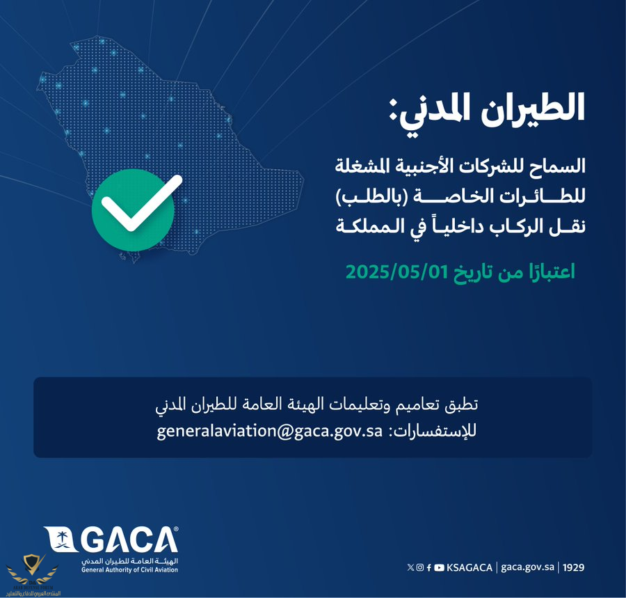 السماح للشركات الأجنبية المشغّلة للرحلات الخاصّة "بالطلب"؛ بنقل الركاب داخلياً في المملكة على طائراتها، بدءاً من 1 مايو المُقبل.