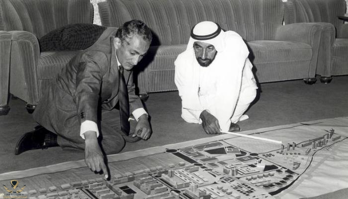 وبخصوص الصورة فهي للشيخ زايد رحمه الله تعالي وهو يشرح ويعلم المهندس مخلوف رحمه الله كيف يريد تخطيط مدينة ابوظبي حيث انه كان يسمع الكلام وينفذ الاوامر حرفيا وخصوصا بعد علمه بالاستغناء عن المهندس الياباني العنيد الذي كان يريد تخطيط ابوظبي كما يريد ،،، سأكتفي بهذا القدر ولكن هل تريد تعرف اكثر من المعلومات عن هذه الصورة،،