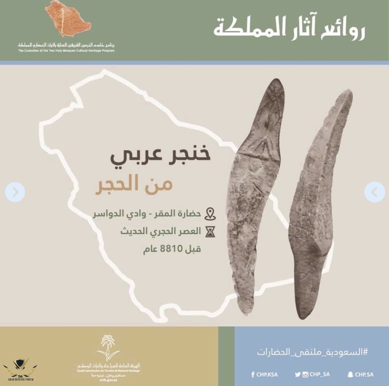- عثر بالموقع على خنجر مصنوع من الحجر له شكل الخنجر العربي الذي يستخدم اليوم في الجزيرة العربية.