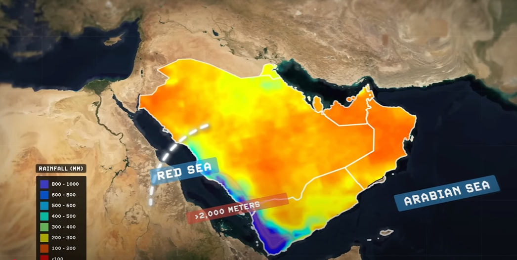 السعودية لديها نسبة مهمة من المتساقطات والمياه الجوفية في عسير وكامل الجنوب الغربي من الدولة ، اساسا مركز السكان في السعودية قبل اكتشاف النفط كان في الجنوب الغربي وجباله حيث هاته الجبال ما تمنع السحب من الدخول الى السعودية وامطارها