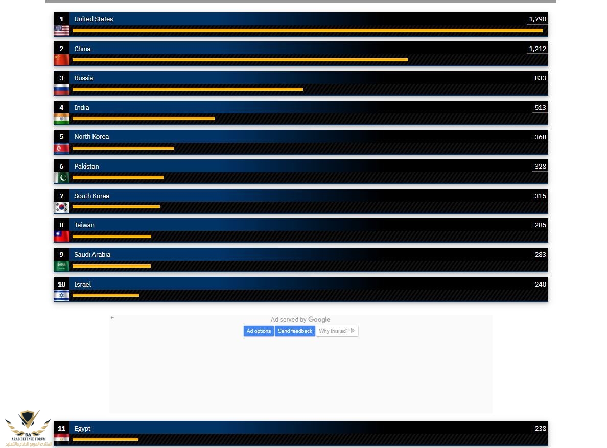 وجاءت السعودية في المركز الـ9 وتلتها إسرائيل في المركز الـ10، بينما مصر في المركز الـ11.