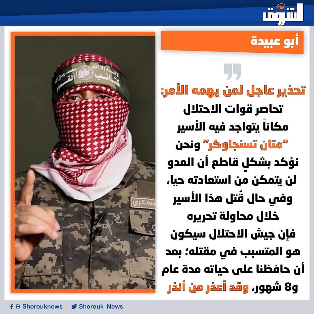 أبو عبيدة: تحذير عاجل لمن يهمه الأمر: تحاصر قوات الاحتلال مكاناً يتواجد فيه الأسير "متان تسنجاوكر" ونحن نؤكد بشكلٍ قاطع أن العدو لن يتمكن من استعادته حيا، وفي حال قُتل هذا الأسير خلال محاولة تحريره، فإن جيش الاحتلال سيكون هو المتسبب في مقتله؛ بعد أن حافظنا على حياته مدة عام و8 شهور، وقد أعذر من أنذر