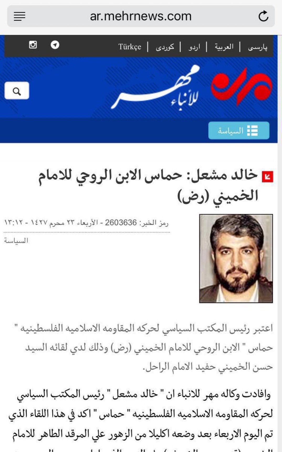 هذا رابط تصريح خالد مشعل من وكالة مهر نيوز الرسمية التابعة لنظام الخميني بعد أن تبرك بقبر الخميني مباشرة أدلى بهذا التصريح