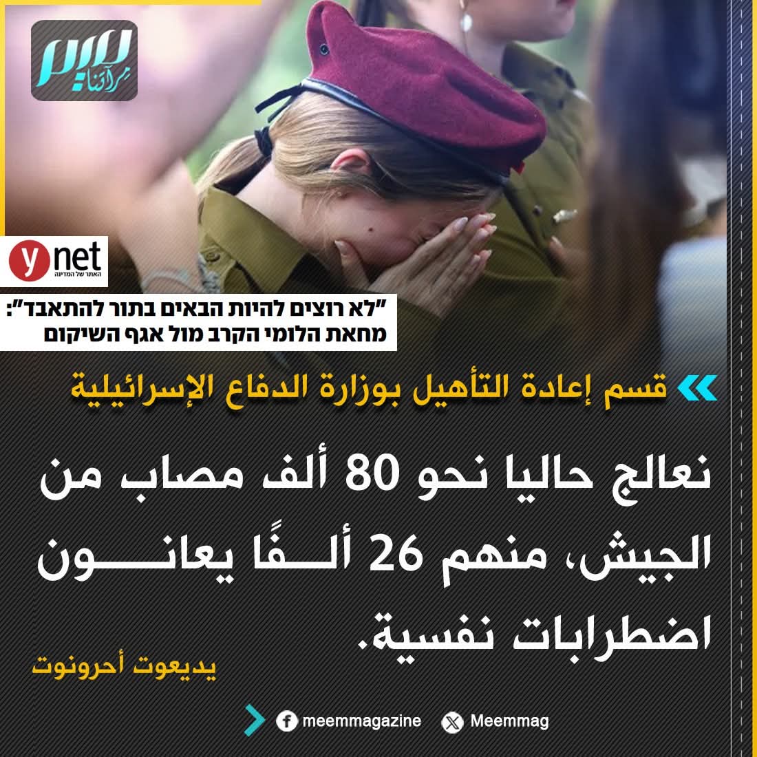 هذه هي الأرقام الحقيقية للمصابين والمعاقين جسديا اعترفت بها وزارة الدفاع الصهيونية للمرة الاولي ٥٤ الف مصاب وفي حكم المعاقين عن أداء الخدمة العسكرية بخلاف ٢٦ الف معاق نفسي