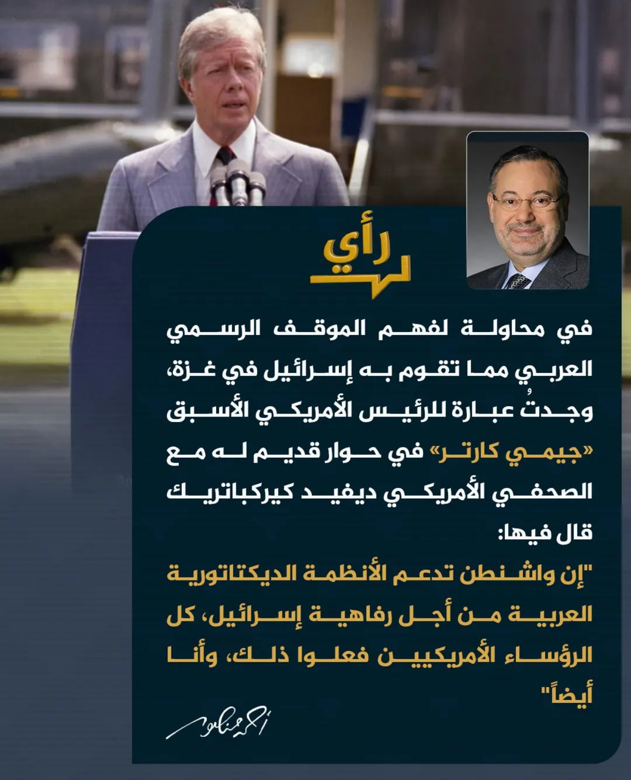 ما رأي الأعضاء بمقوله كارتر !! كذب و بهتان كالعاده ؟!! أن تقيه سياسيه و مزايدات ؟!!! الم يشر ترامب للسيسي بكونه :ديكتاتوره المفضل"'..أم انه ذلك ايضا مزايدات سياسيه و دجل و ليس فضح و تعريه لًواقع حقيقي يُطَبّل "لمحاسنه" ليل نهار في الاعلام!
