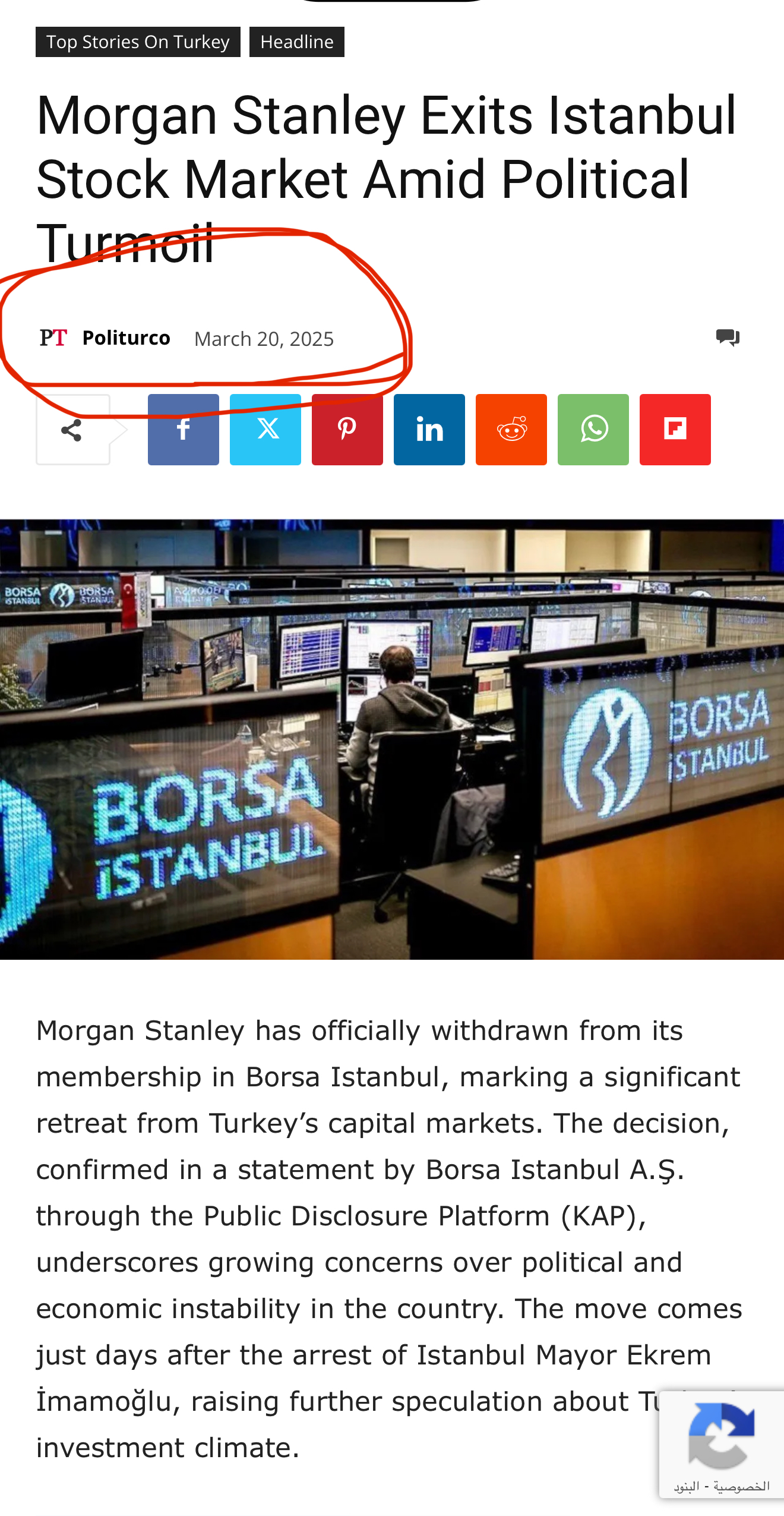 ⚠️ وسائل إعلام تركية تنشر خبر انسحاب شركة "مورجان ستانلي" للأوراق المالية من عضوية بورصة إسطنبول تزامنا مع الأحداث السياسية الداخلية في تركيا.