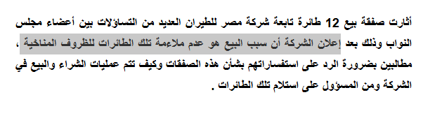 لكن الشركة حسب البرلمان المصري او احد اعضائه ان البيع تم بسبب عدم ملائمة الطائرة للظروف المناخية وليس بسبب المحركات .
